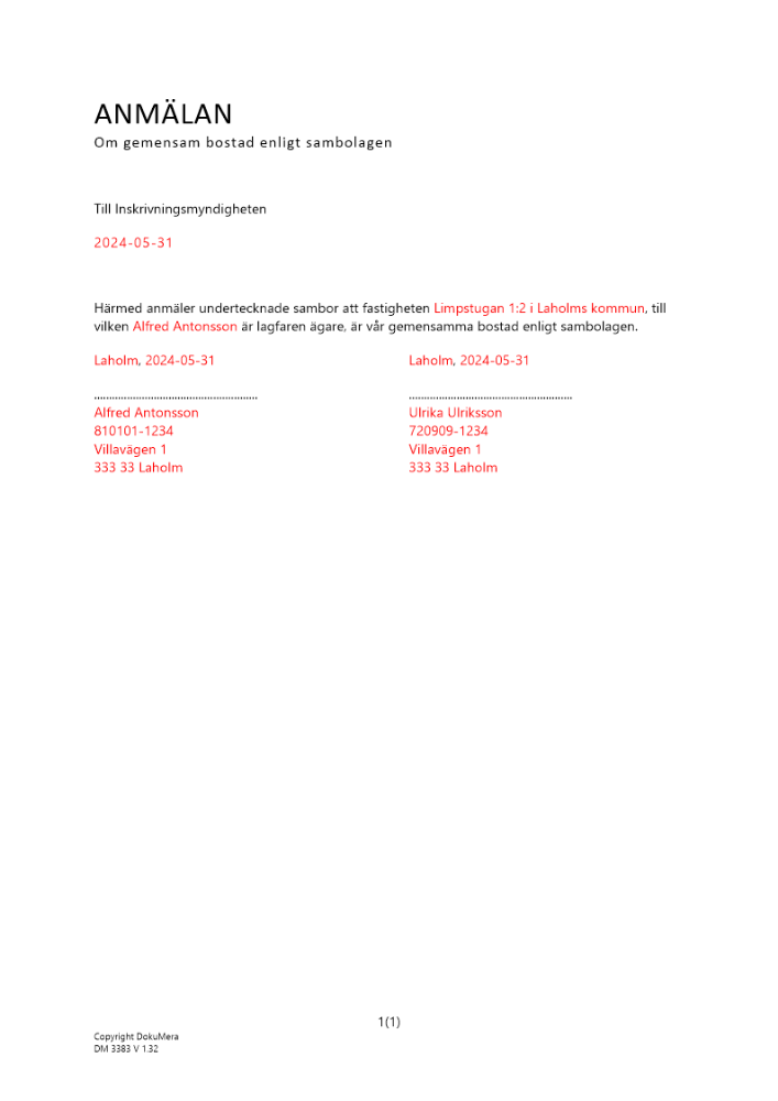 Produkter taggade med 'Anmälan om gemensam bostad gemensam bostad fastighet samboförhållande sambor gemensam egendom separa'