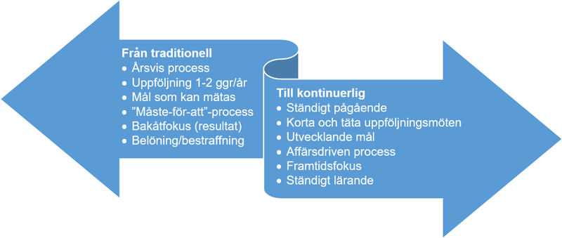Processen i sig är från traditionell till den moderna agila som förespråkas är inte så olik, det handlar om att sätta övergripande mål, fördela de och följa upp. Det som skiljer är processen som kortas ner avsevärt, både längden på målen och uppföljningen. Att ses en gång per år eller bästa fall halvårsvis och utvärdera mål man satt 1 år eller 6 månader tidigare är ofta inte alls relevant längre. Antingen blir målen för oprecisa eller så är förutsättningar helt annorlunda. Meningen är mål och processen för att nå dit ska ge riktning, tydlighet och energi. Det är få av oss som klarar att ha ett årslångt mål i sikte hela tiden. När man har det långsiktiga målet och bryter ner till delmål som är ca 90-dagarsmål, då finns det vetenskaplig bevisning att många kan hålla fokus. När vi dessutom följer upp varannan vecka det är då skapar vi förutsättningar att nå målen.