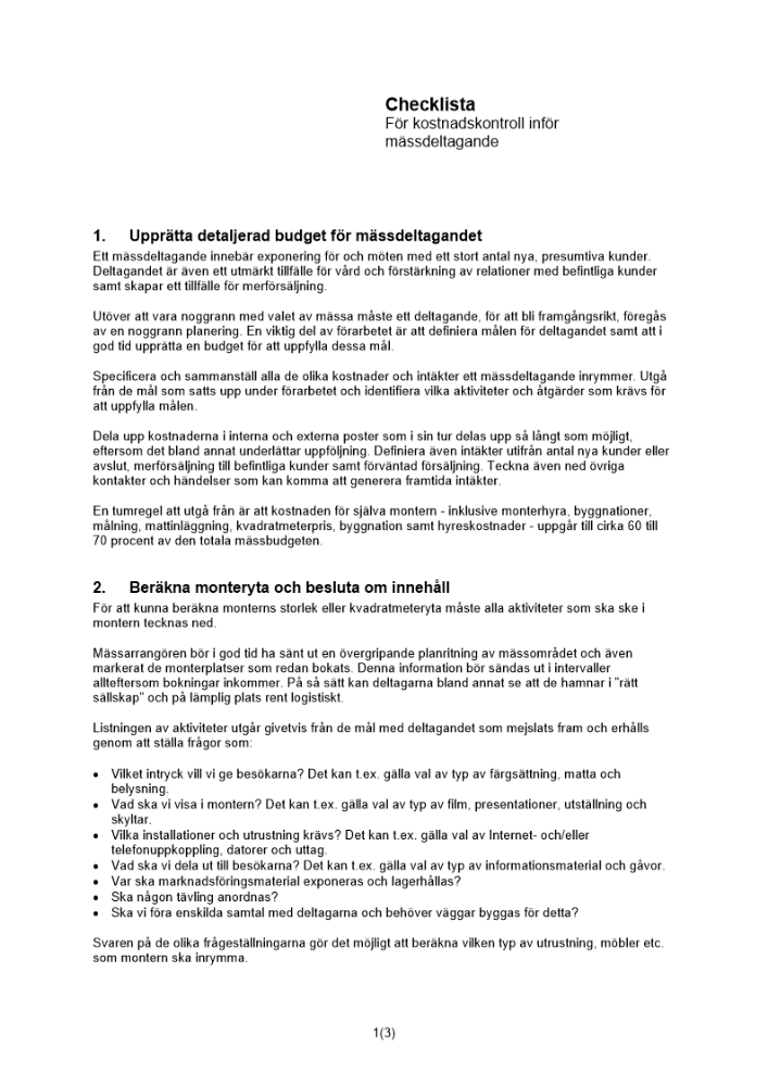 Produkter taggade med 'mässor mässa kostnadskalkyl Checklista kostnadskontroll mässa mässdeltagande budget kunskapsbank'