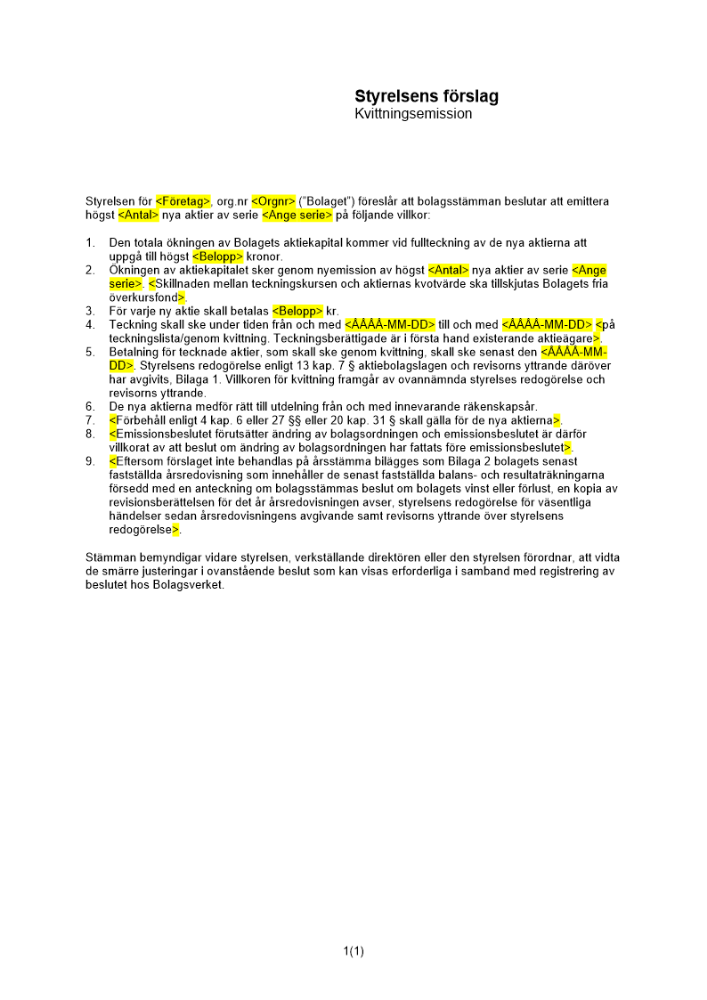 Produkter taggade med 'Kvittningsemission kvittning emission förslag styrelse bolagsstämma aktier fordran publikt avstämnin'