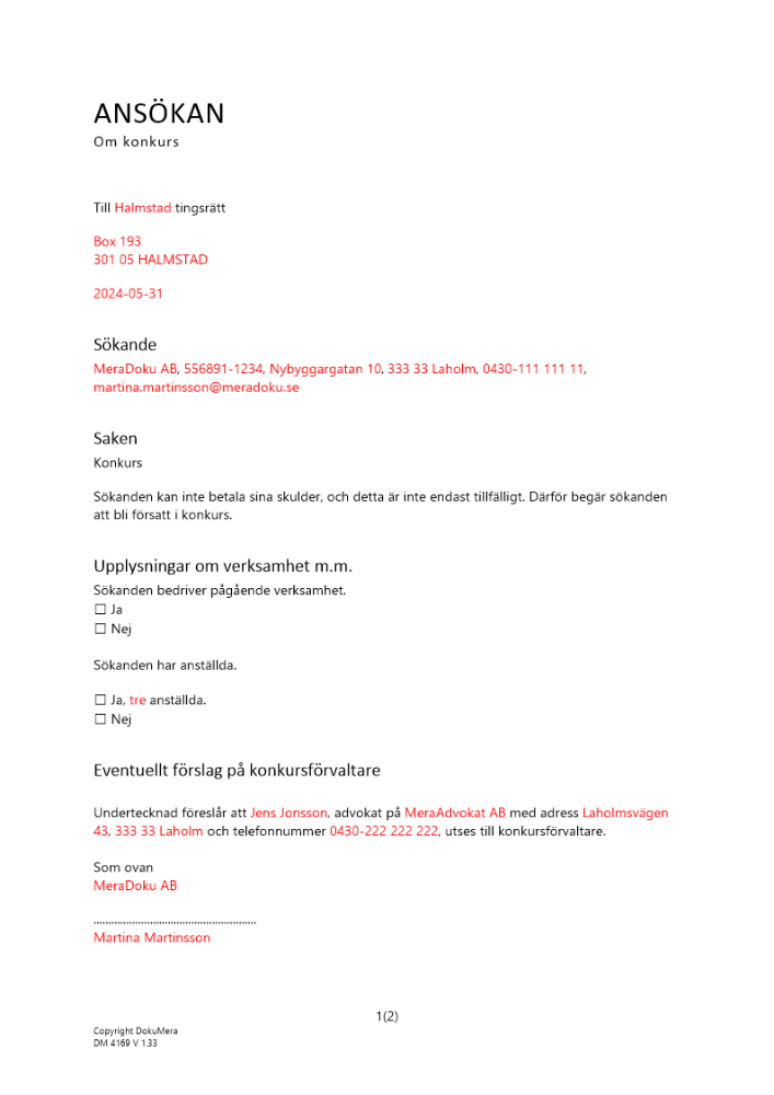Produkter taggade med 'Konkursansökan Egen ansökan konkurs tillgångar skulder fordringsägare tingsrätten obestånd'