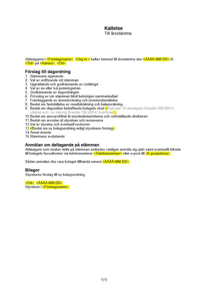 Produkter taggade med 'kallelse bolagstämma kallelse bolagsstämma Kallelse årsstämma disponibla vinstmedel bolagsordning bolagsstämma arbetsordning dagordning'
