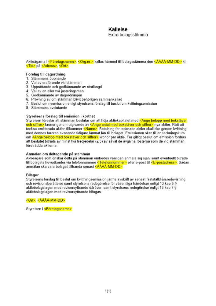 Produkter taggade med 'kallelse extra bolagsstämma bolagsstämma stämma bolag aktiebolag ab'