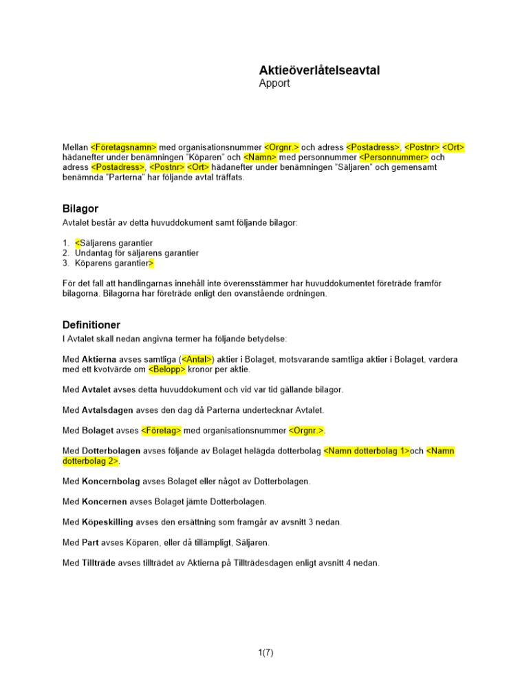 • Avtal aktieöverlåtelse