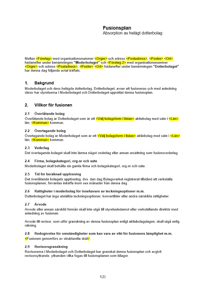 Produkter taggade med 'Fusionsplan för absorption fusionsplan absorption dotterbolag moderbolag fusion styrelse helägt bola'