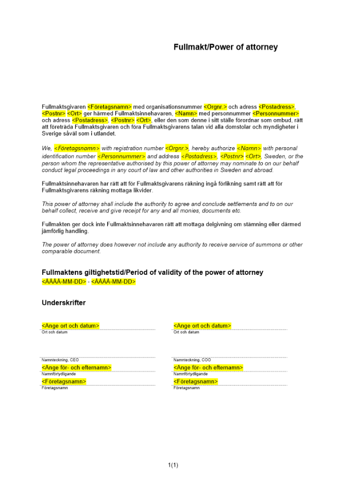 Produkter taggade med 'Rättegångsfullmakt rättegång part engelska svenska fullmakt företräda ombud'