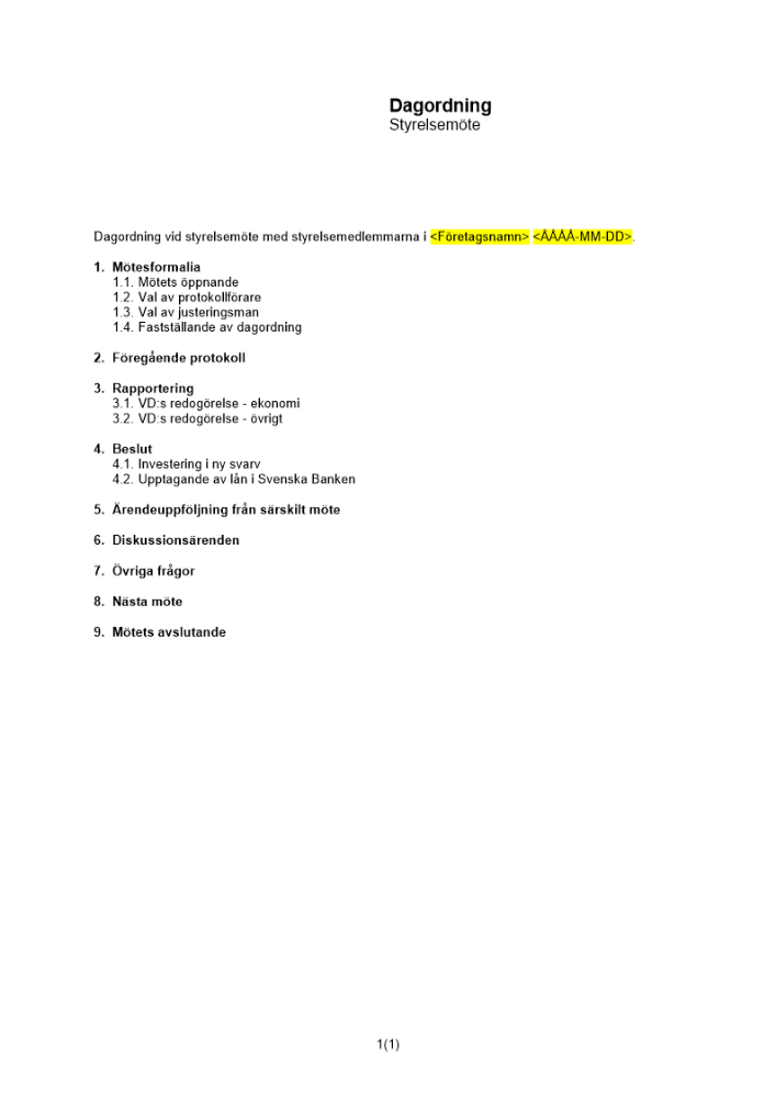 Produkter taggade med 'Dagordning styrelsemöte utökad aktiebolag ordförande sekreterare ledamöter kallelsen'