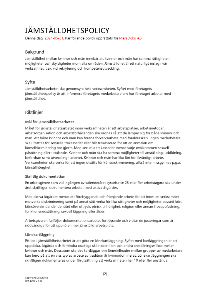 Produkter taggade med 'Jämställdhetspolicy jämställdhet medarbetare policy arbetstagare jämlikt'