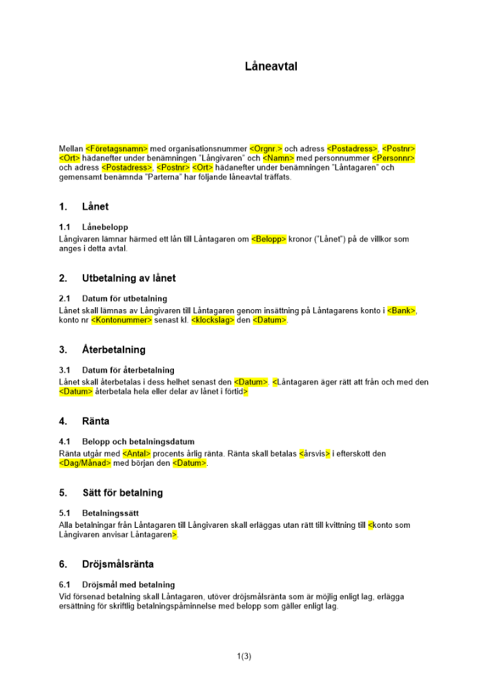 Produkter taggade med 'Låneavtal Fast ränta säkerhet klausuler återbetalning dröjsmålsränta uppsägning lånevillkor'