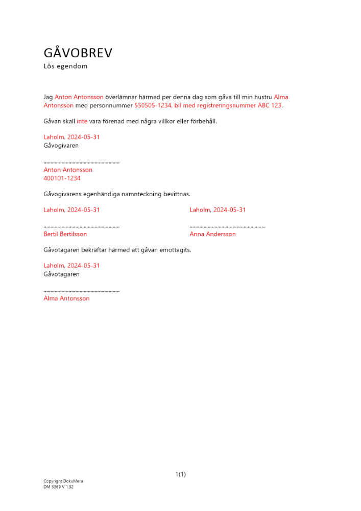 Produkter taggade med 'Gåvobrev mellan makar giftorättsgods gåvobrev lös egendom lösöre gåva'